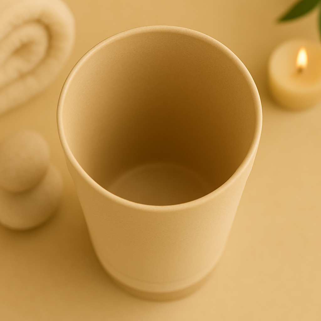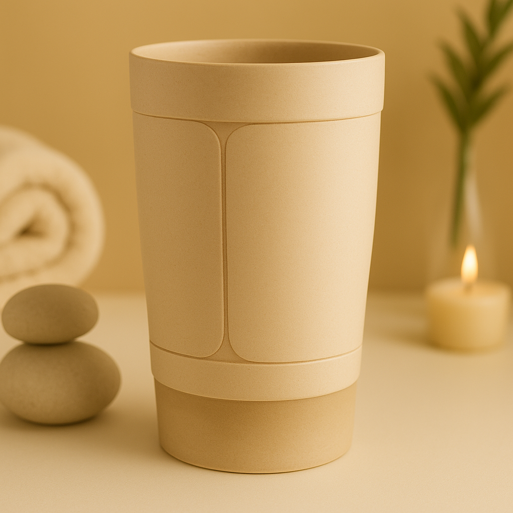De beker ondersteunt het lichaam bij natuurlijke reiniging en helpt bij het verbeteren van de spijsvertering. Tijdens het gebruik komt een subtiel aardse geur vrij die kalmerend werkt en bijdraagt aan ontspanning.